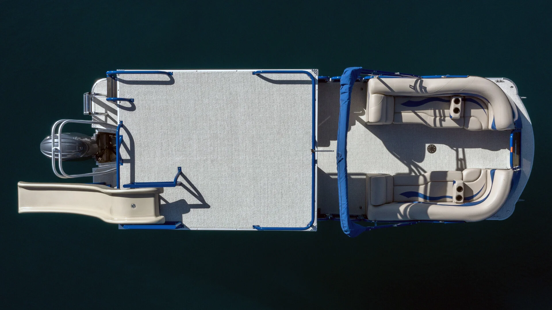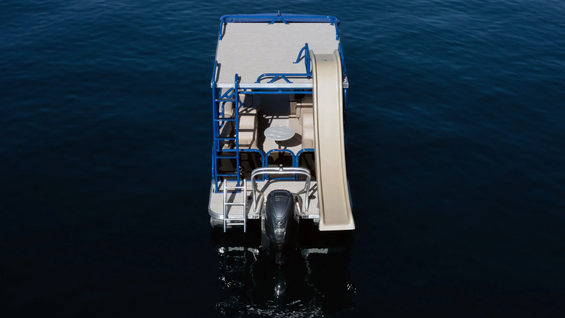 - Signature Railing & Upper Deck: 2-inch round sweptback railing system paired with an elevated sundeck and integrated slide for maximum visibility and on-water fun.